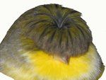 Sogenannte „Fasanenohren“ stellen ein weiteres Problem bei den Coronas dar. Tendenziell wachsen die Federn im Bereich der Ohren in unterschiedliche Richtungen. Schlimmstenfalls entstehen dann sogenannte „Fasanenohren“ bzw. „Hörner“. Ist dieses Problem bei ansonsten sehr guten Hauben stark ausgeprägt, sollte hier auf eine Weiterzucht mit den Tieren m.E. dennoch konsequent verzichtet werden. Das Ziel sollte es sein, dass die Corona in diesem Bereich absolut sauber und anliegend ist, ohne Anzeichen von „Fasanenohren“. Man sollte sich aber auch darüber im klaren sein, dass die meisten Ausstellungsvögel vor der Ausstellung entsprechend „schaufertig“ gemacht werden, was bedeutet, dass im Bereich der Ohren unter Umständen die eine oder andere Feder gezupft wird. Die absolut perfekte Corona gibt es nur selten.
